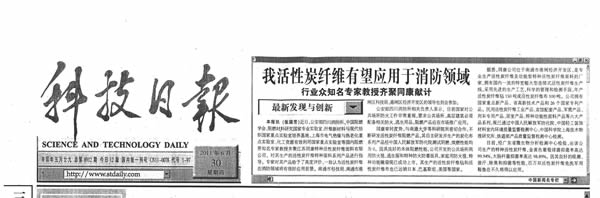 2011年6月30日科技日報,同康活性炭纖維有望應用于消防領域----行業眾知名專家教授齊聚同康獻計獻策。